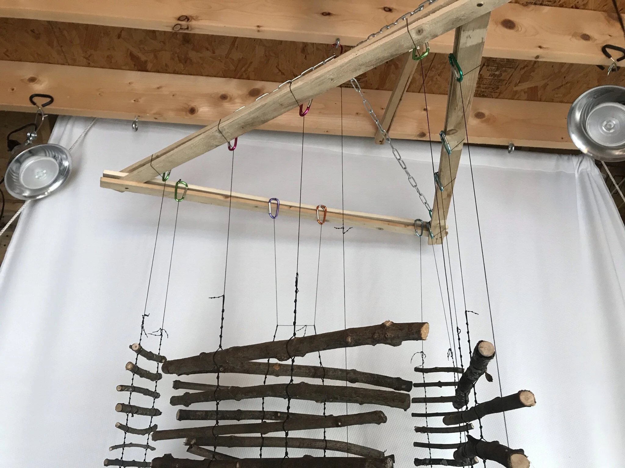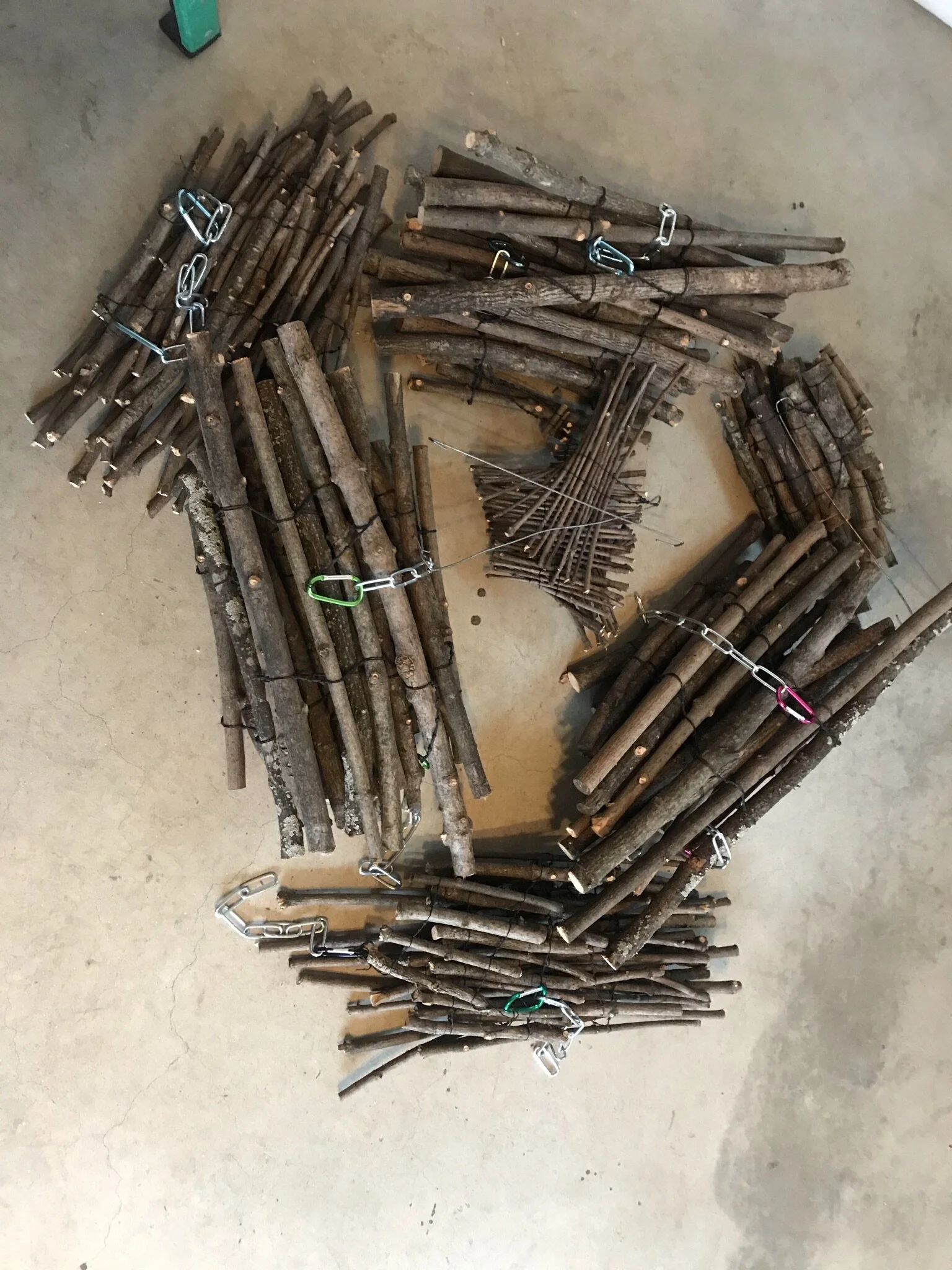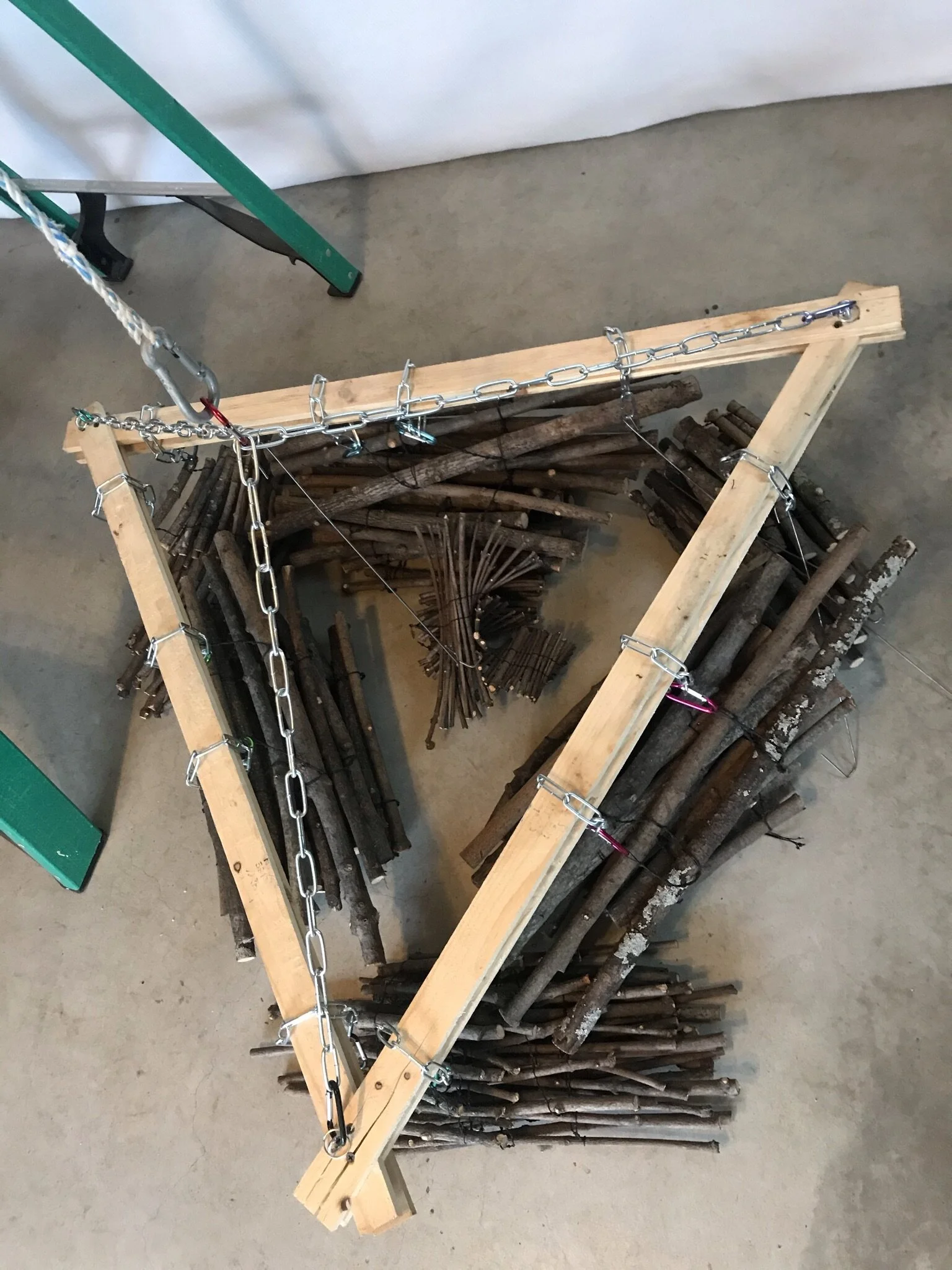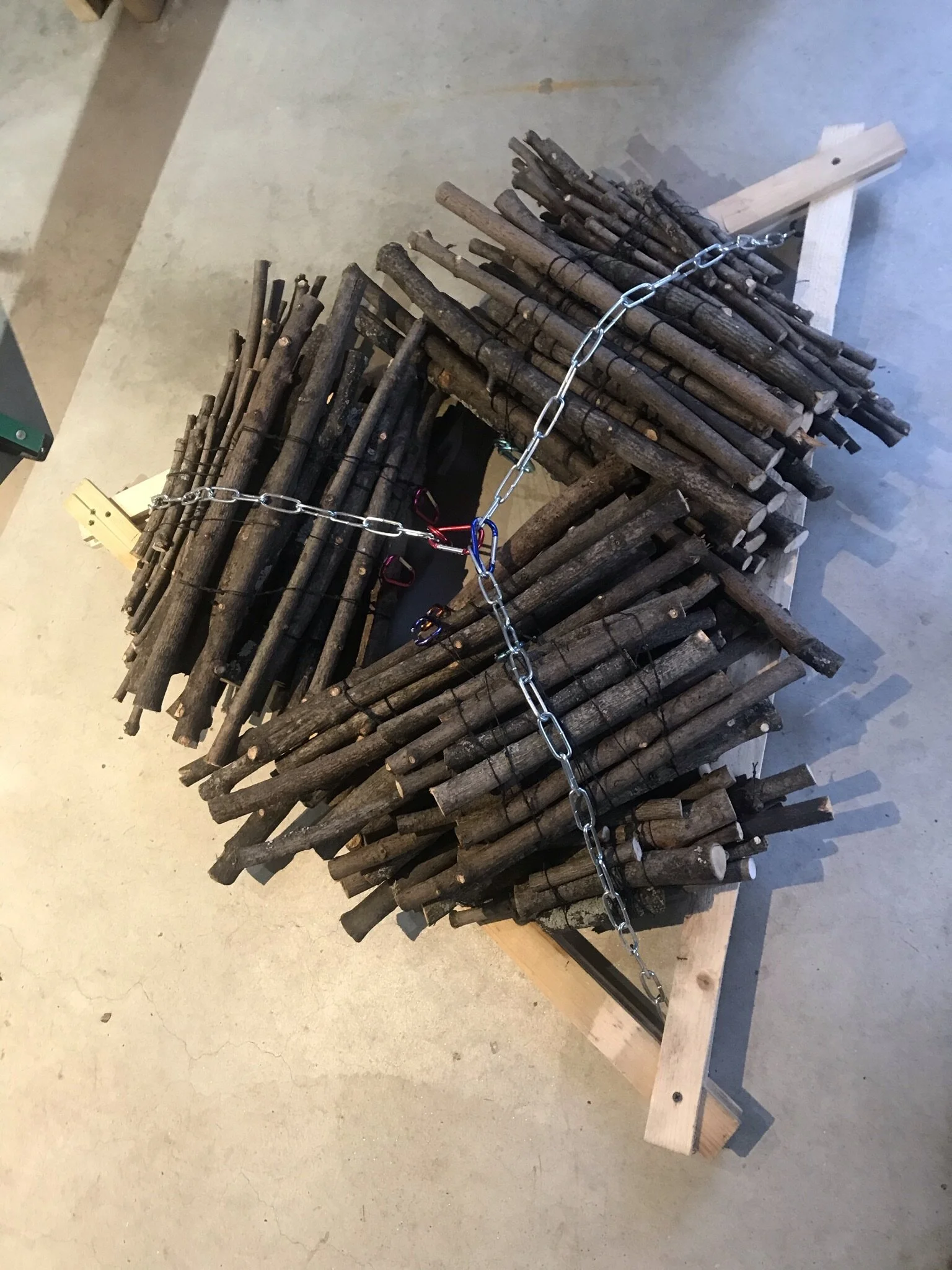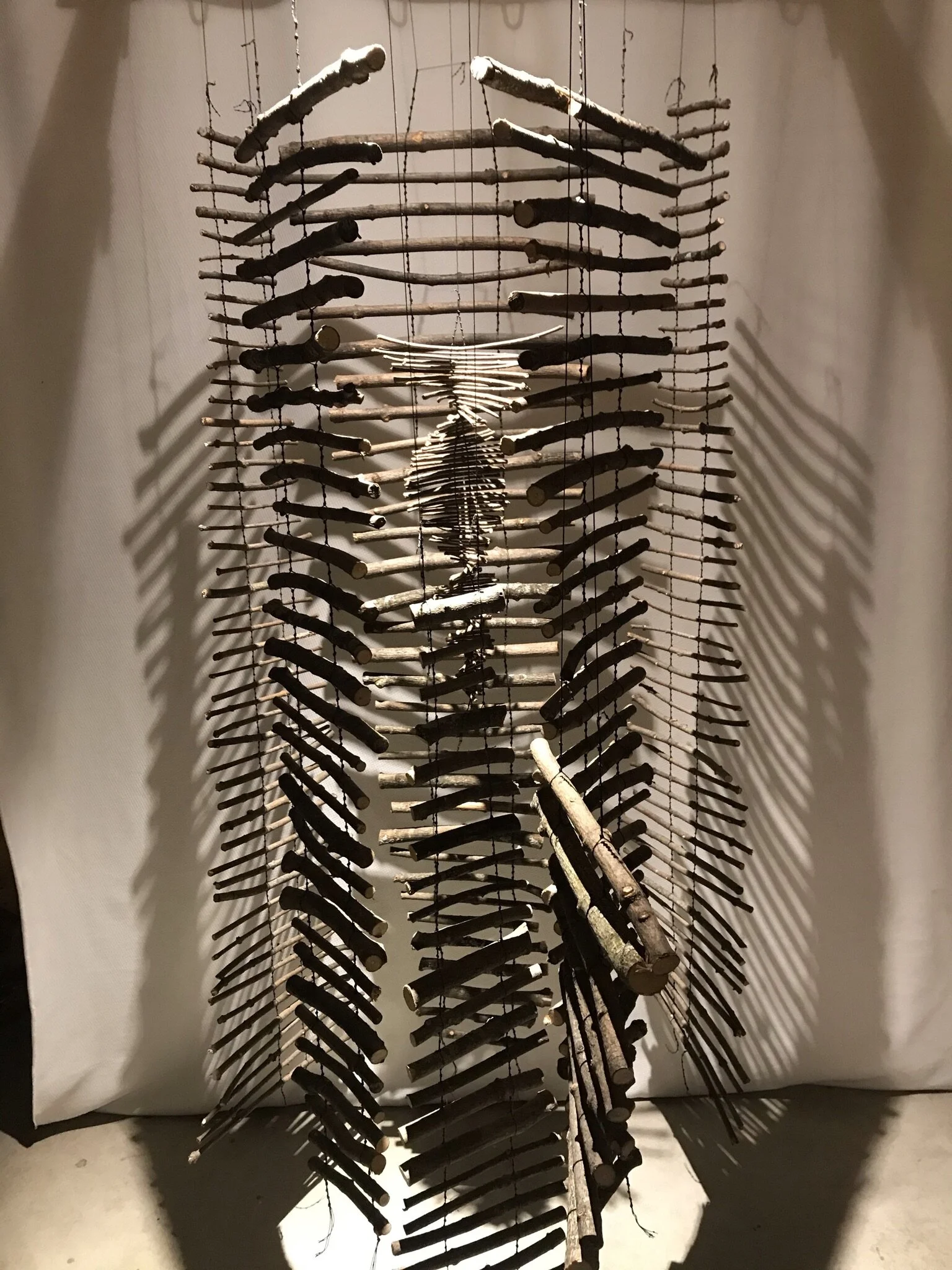 36" diameter x 80" long; wood sticks with bark, black waxed cord; 2020; ArtsWorcester - Inside Voices: A Members Exhibition, Spring 2021