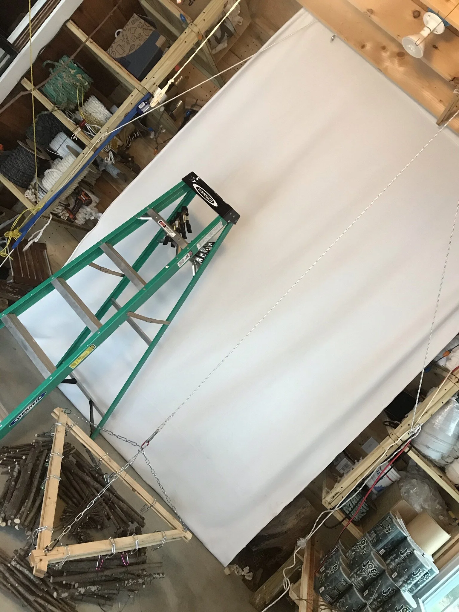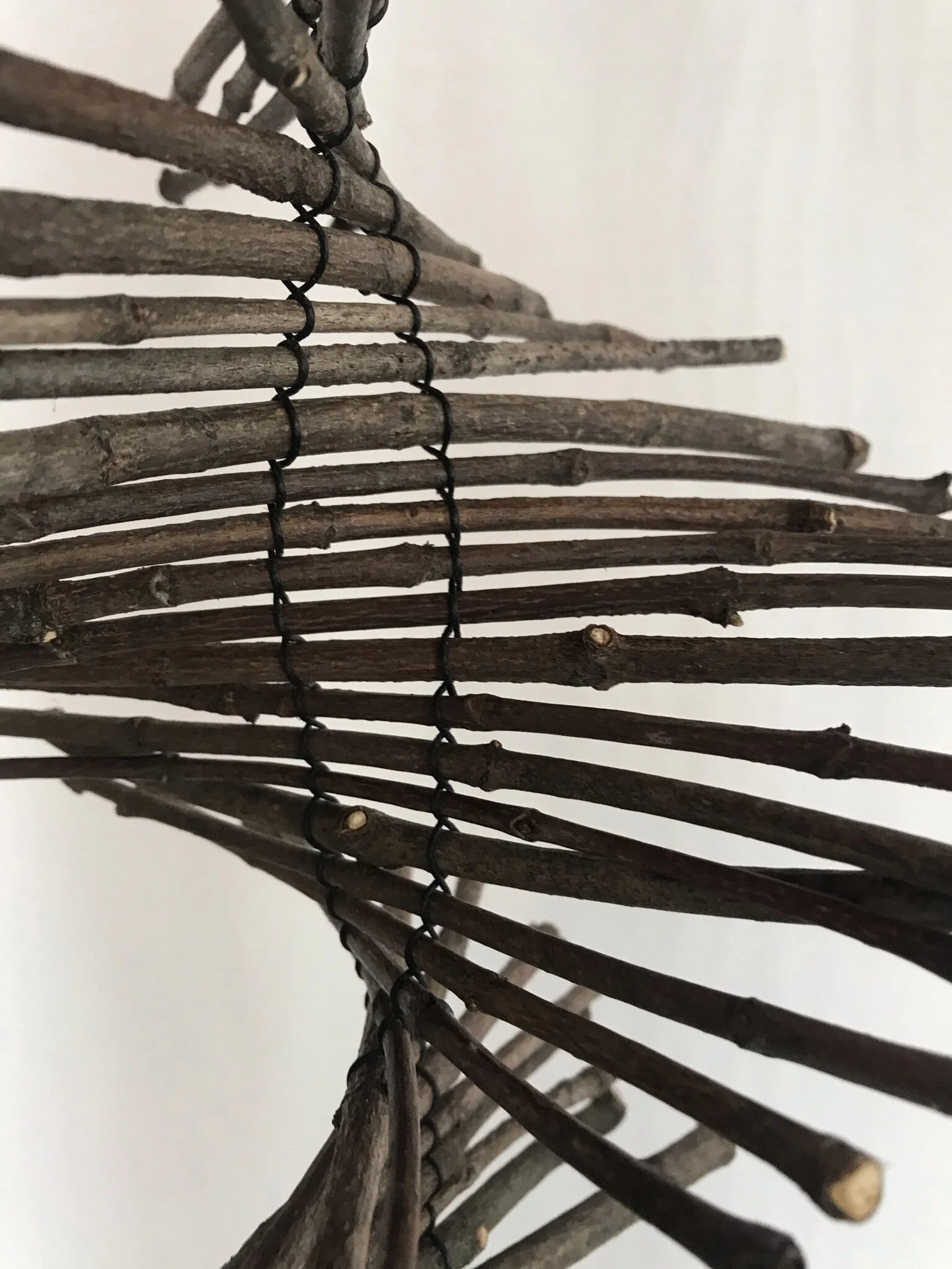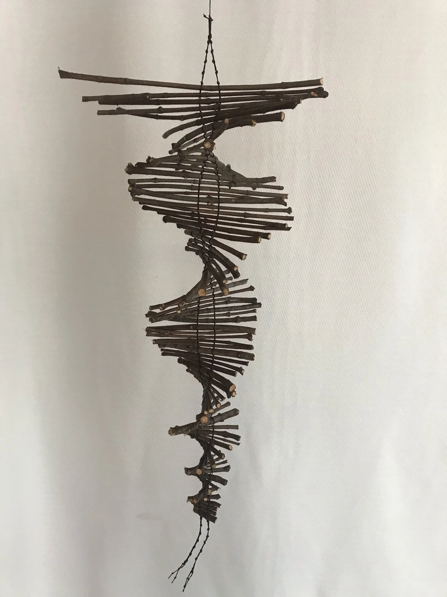 I spent most of my art production time in 2020 working on stitching sticks together to make blinds, mobiles, and other suspended sculptures from wood and rope. When I explored the items on loan to ArtsWorcester from FAM, "A Woman at a Window, Man Outside," sparked a thought to build a 3 dimensional version from several components of my work. "Five Blinds", originally linear, was joined at the sides to build the house; "Blind Pair" became the window sill and the Man Outside; "Woven Stick Spiral" is the Woman at a Window, an enclosed focal point of the final assembly.