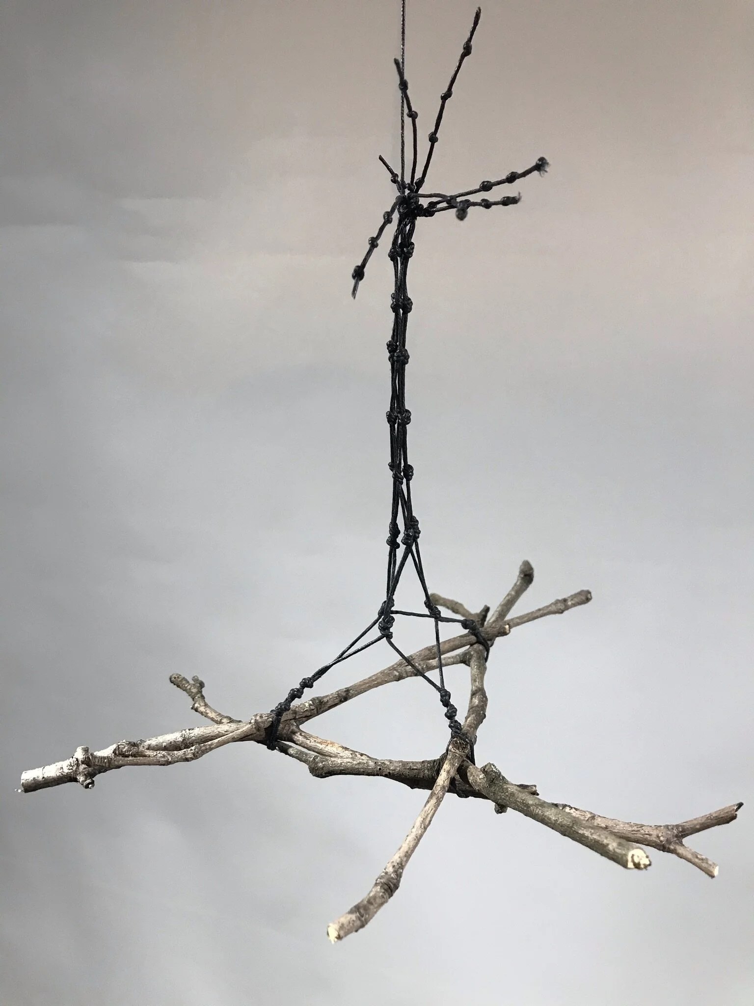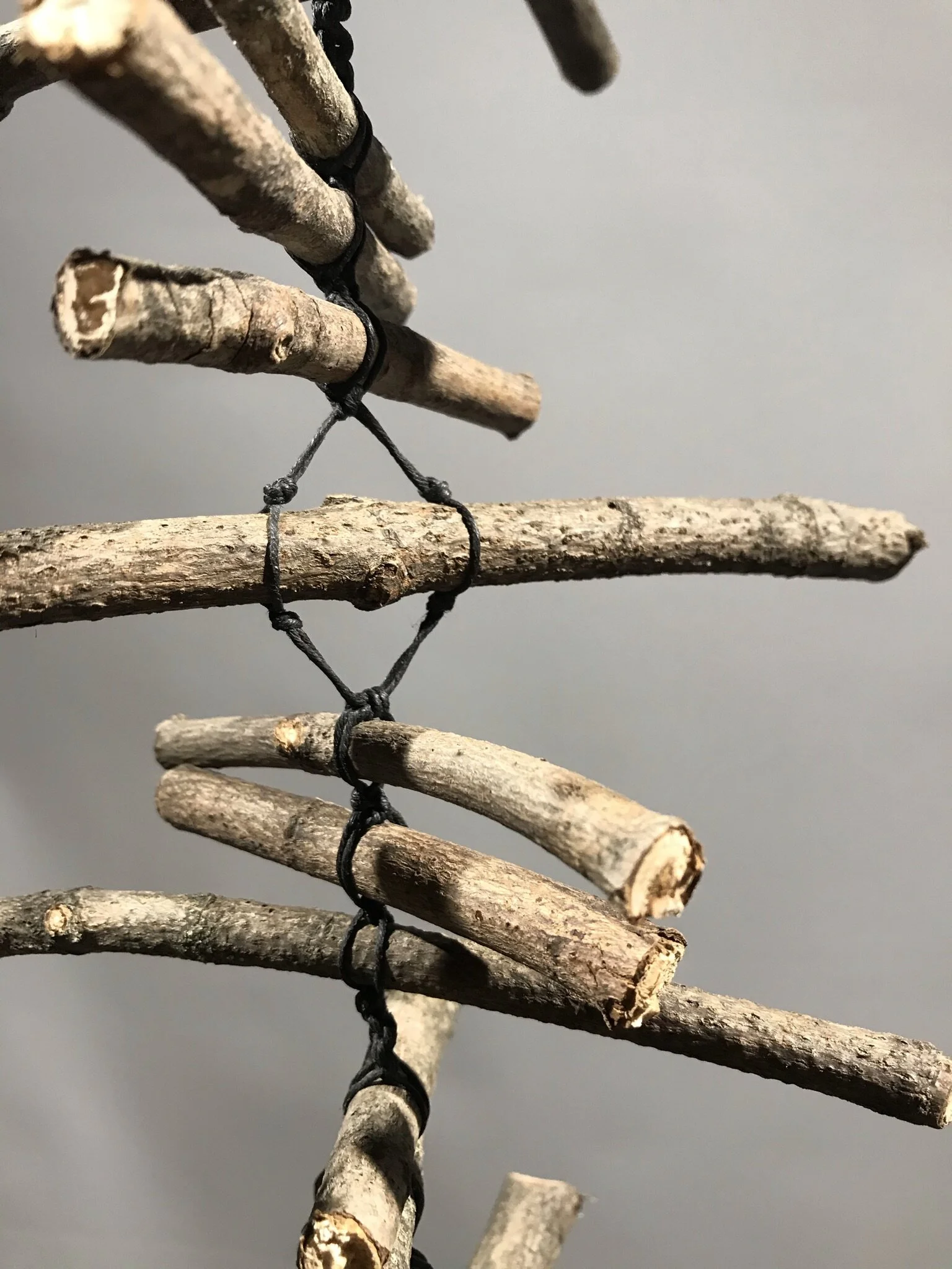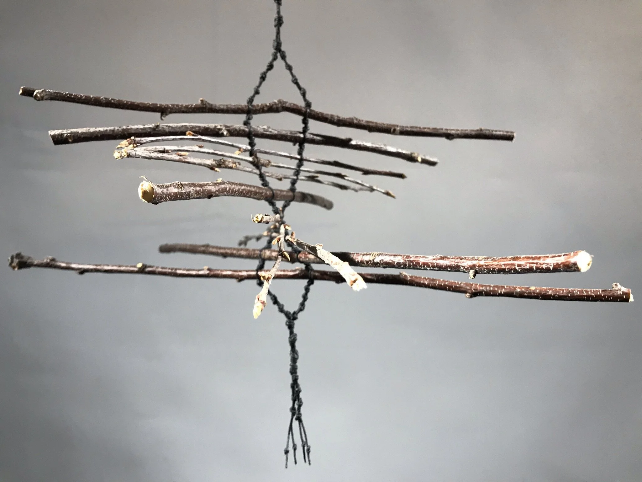 Mobiles, more blinds, and other suspensions using sticks and branches from 2020 tree pruning. Cherry, Dogwood, Maple and Oak components bound by braiding, knotting, and weaving waxed, black cord.