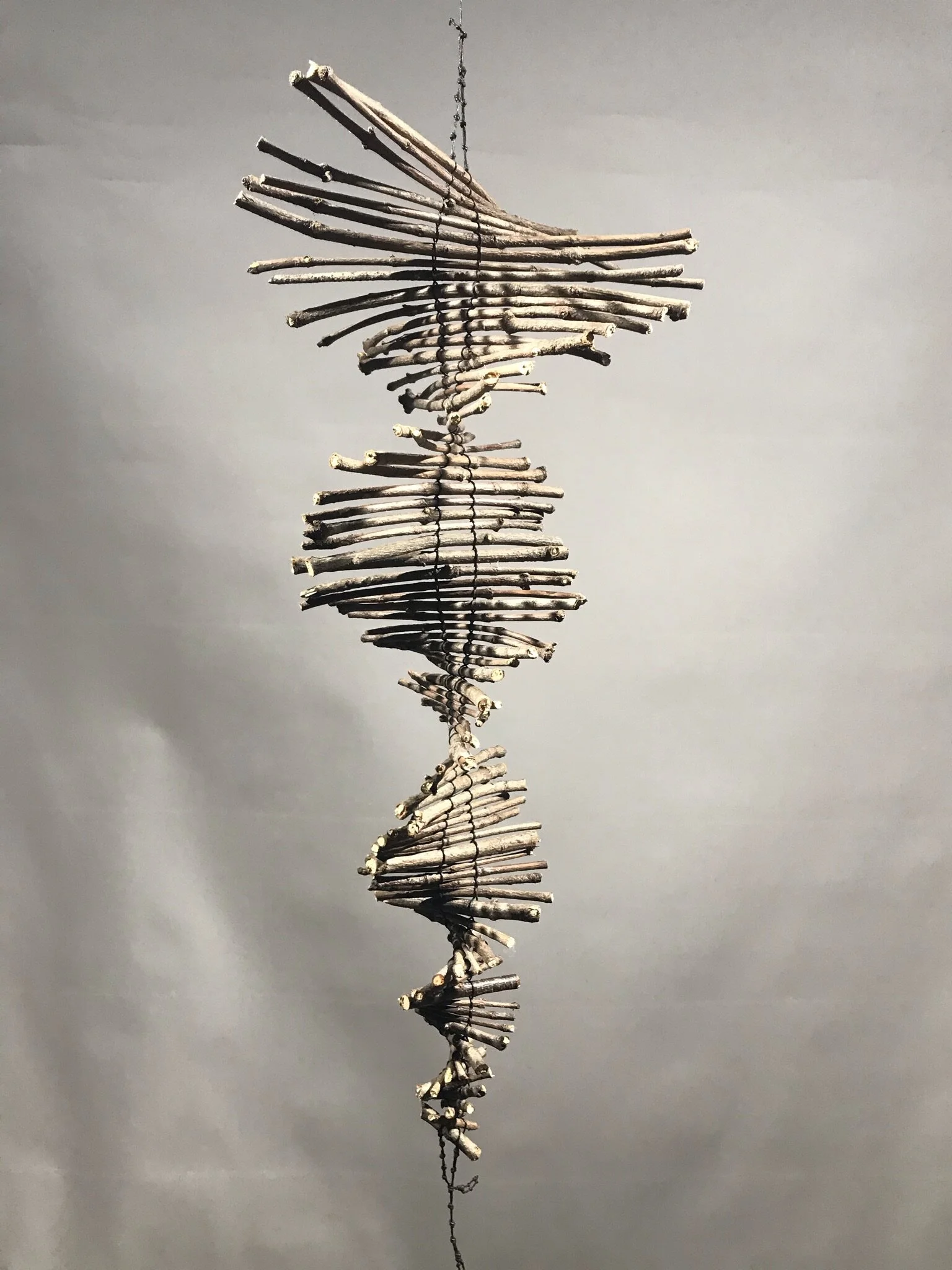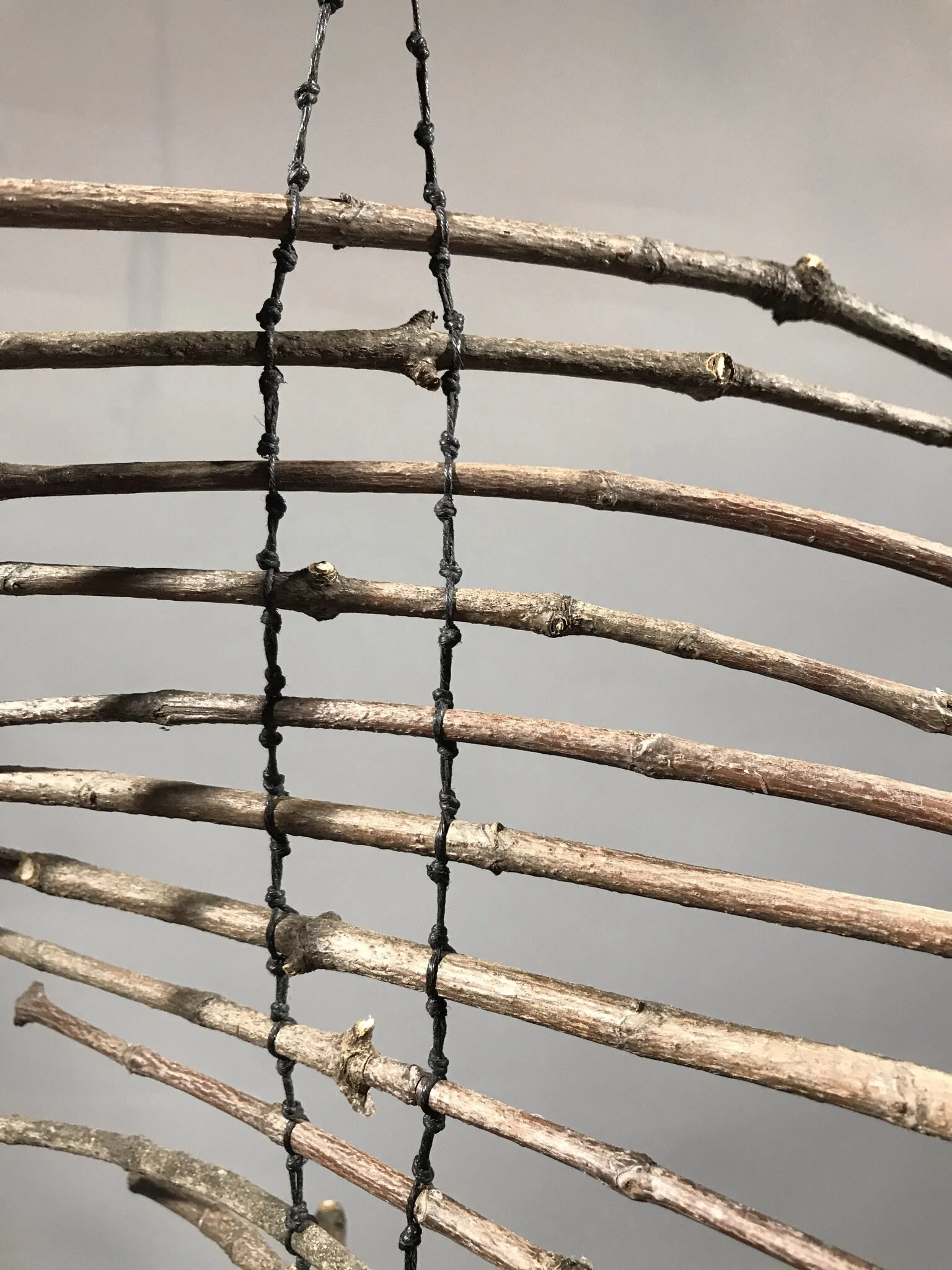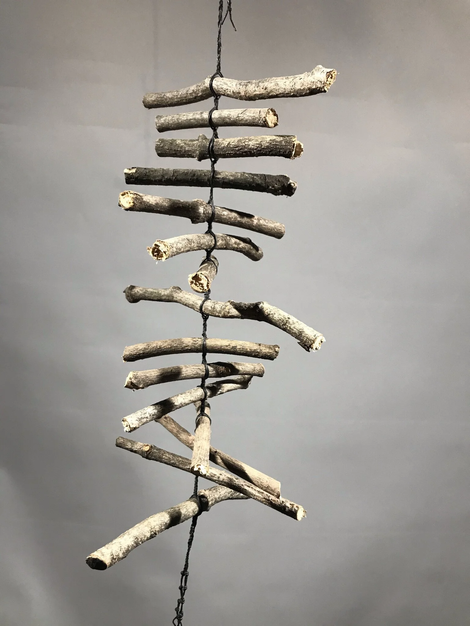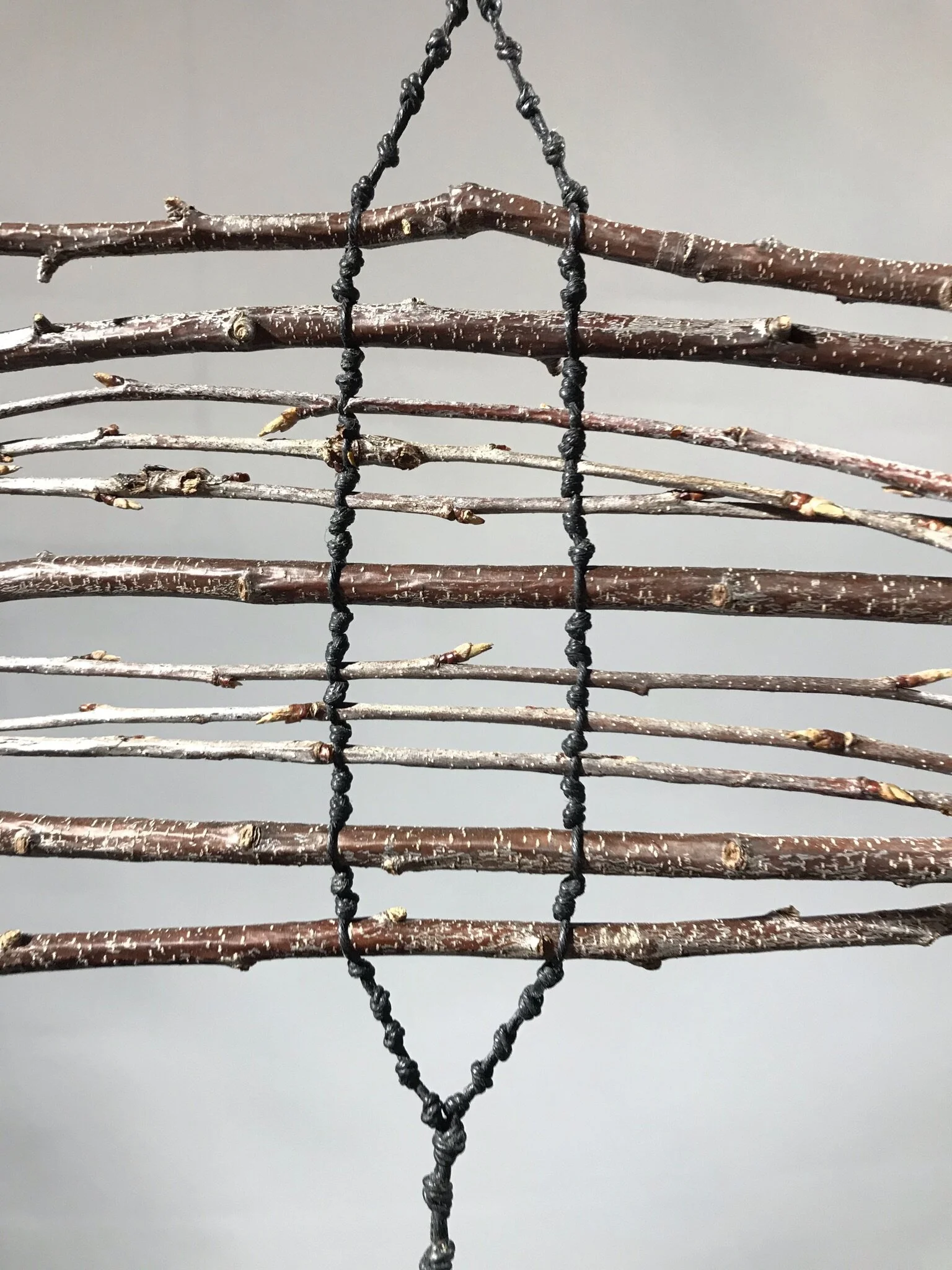 Mobiles, more blinds, and other suspensions using sticks and branches from 2020 tree pruning. Cherry, Dogwood, Maple and Oak components bound by braiding, knotting, and weaving waxed, black cord.
